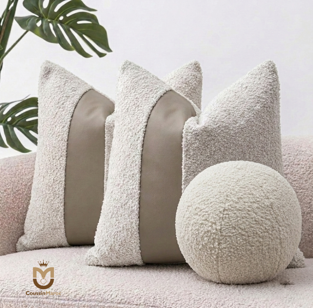 Pack Trio Prestige – Duo Bouclé & Cuir Taupe + Coussin Boule Signature